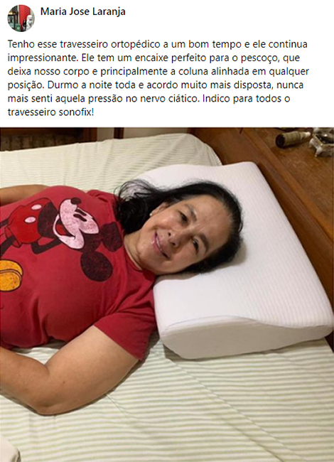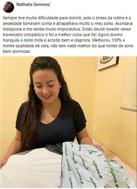 "Eu tenho uma protusão cervical e já tive várias crises. Às vezes eu ia dormir bem e acordava com uma dor insuportável, que eu não conseguia nem me mexer. Depois que passei a usar o Sonofix vocês não tem ideia o tanto que isso melhorou as minhas dores e até as minhas noites de sono."