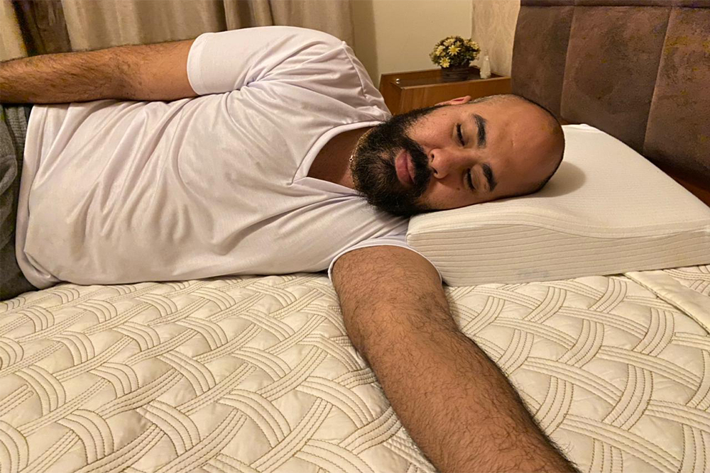 Douglas comentou também que geralmente começa a noite dormindo de barriga para cima, mas naturalmente durante a noite se vira de lado, e mesmo assim o travesseiro se adaptou perfeitamente, sem interromper o sono profundo no meio.
