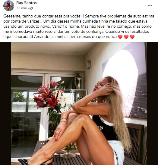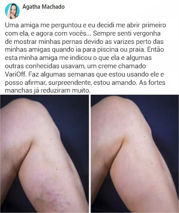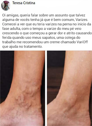 "Comecei a perceber os resultados logo no primeiro uso. Ele me deu uma sensação de alívio imediato nas pernas, deixou muito mais leve, eliminou a dor e relaxou também meus pés. Eu tive que usá-lo de manhã e à noite. Tirei fotos minhas antes e depois de usar o creme, para avaliar sua eficiência:"